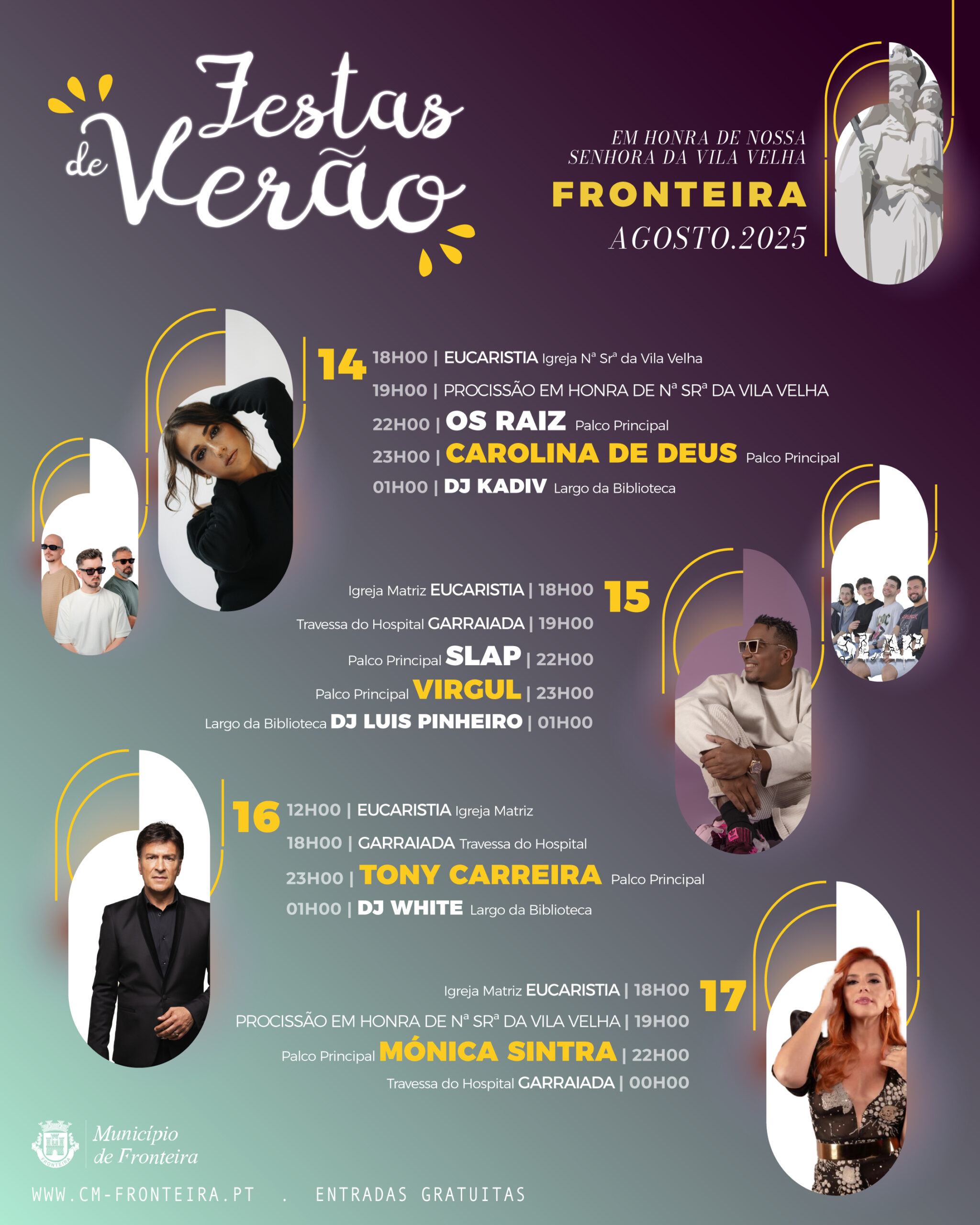As festividades terão como ponto central as tradicionais Eucaristias e Procissões em honra de Nossa Senhora da Vila Velha, demonstrando a forte ligação da comunidade à sua padroeira. Paralelamente, o centro da vila ganhará vida com concertos musicais que trarão artistas de renome para animar as noites de verão.