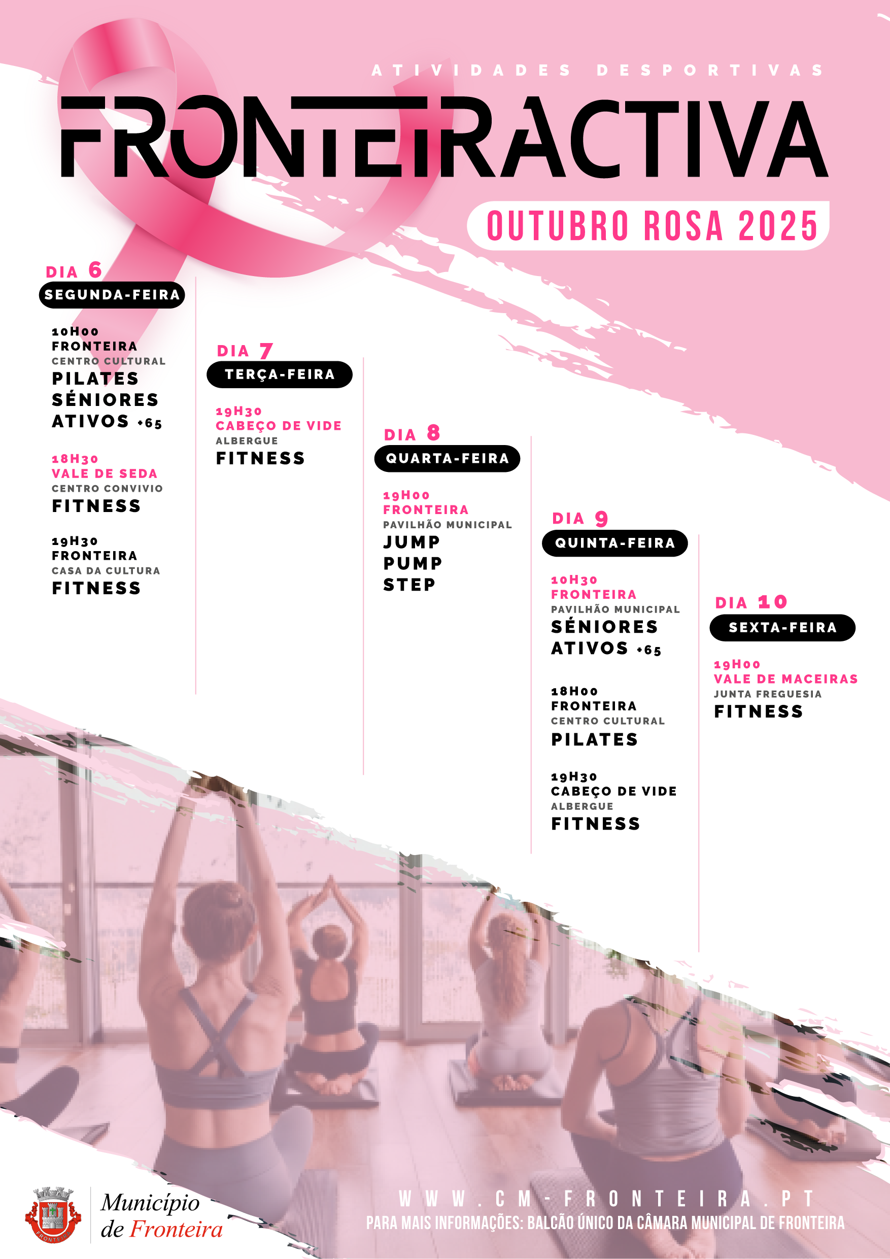 Atualizado em 03/10/2025De 6 a 10 de outubro, o concelho de Fronteira vai vestir-se de rosa para marcar o Outubro Rosa, movimento internacional dedicado à consciencialização para a prevenção e diagnóstico precoce do cancro da mama.