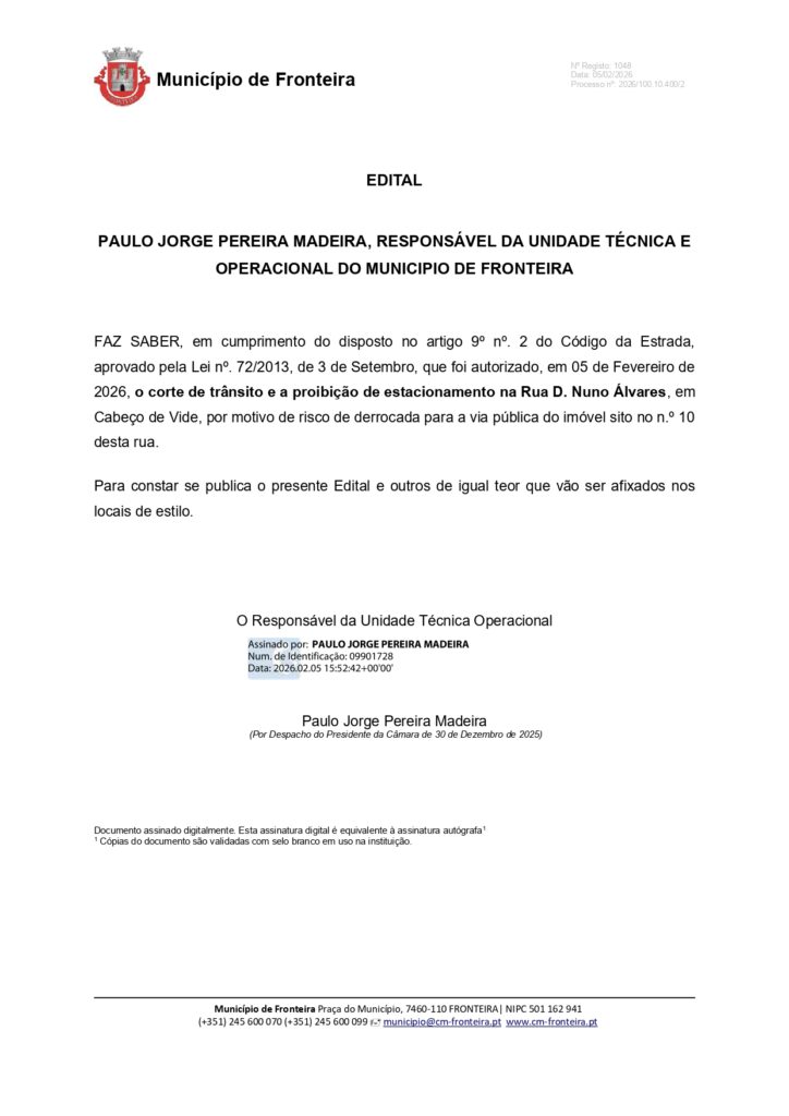 Na sequência da deteção do risco de queda de um edifício na Rua D. Nuno Alvares em Cabeço de Vide, informa-se que a mesma se encontra cortada ao trânsito e estacionamento de veículos.